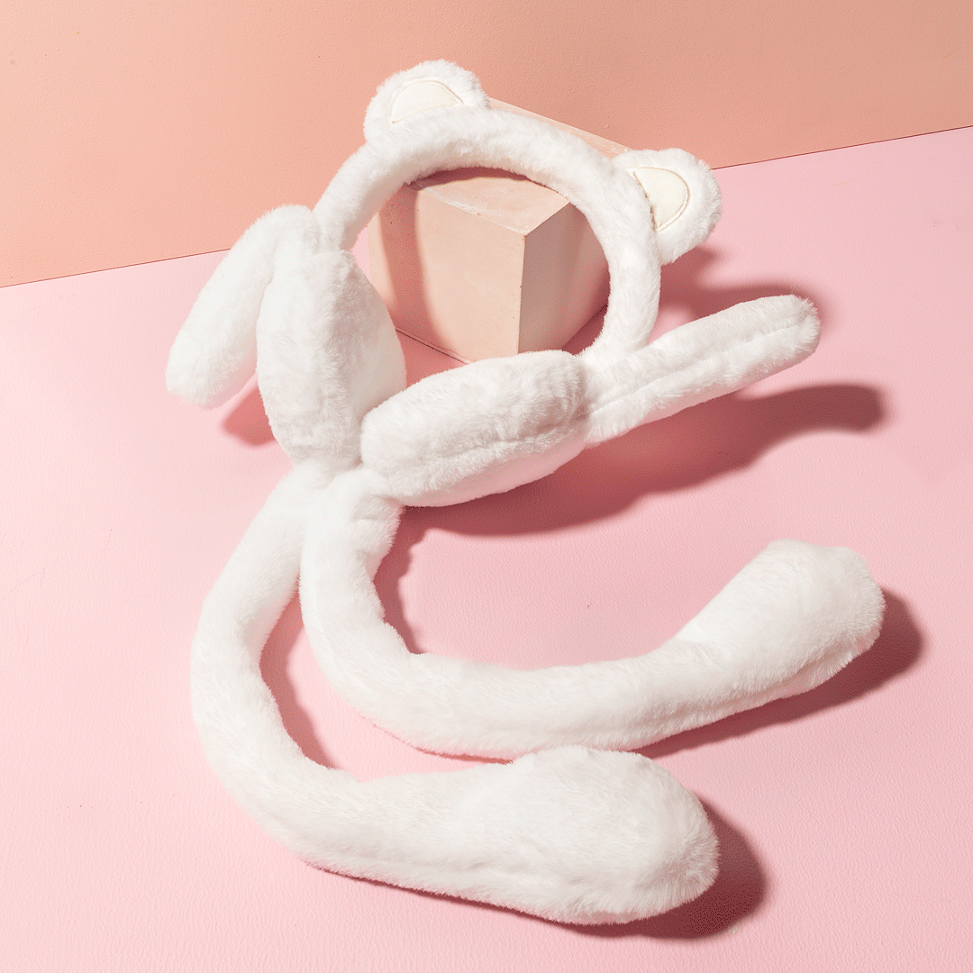 Place over ears and gently pull the plush paws to make the bunny ears move.