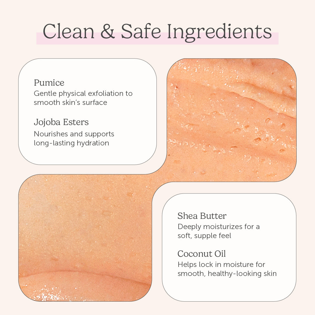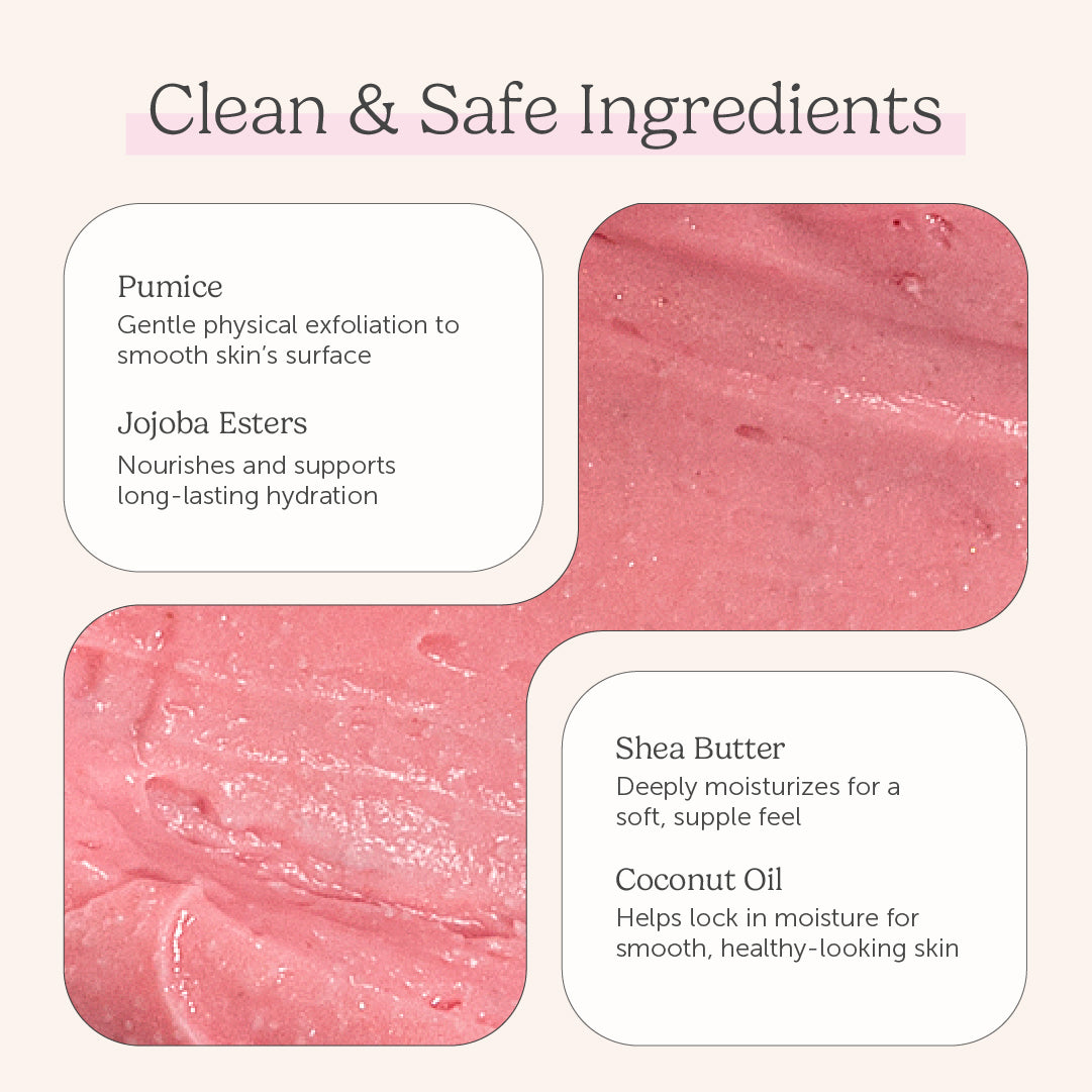 Fruit Smoothie: Aqua (Water), Jojoba Esters, Butyrospermum Parkii (Shea) Butter, Cocos Nucifera (Coconut) Oil, Pumice, Emulsifying Wax NF, Cetyl Alcohol, Stearic Acid, Parfum (Fragrance), Phenoxyethanol, Caprylyl Glycol, Benzyl Alcohol, Tocopheryl Acetate, Maranta Arundinacea (Arrowroot) Powder, Fragaria Ananassa (Strawberry) Powder, Mica, Iron Oxide, Titanium Dioxide