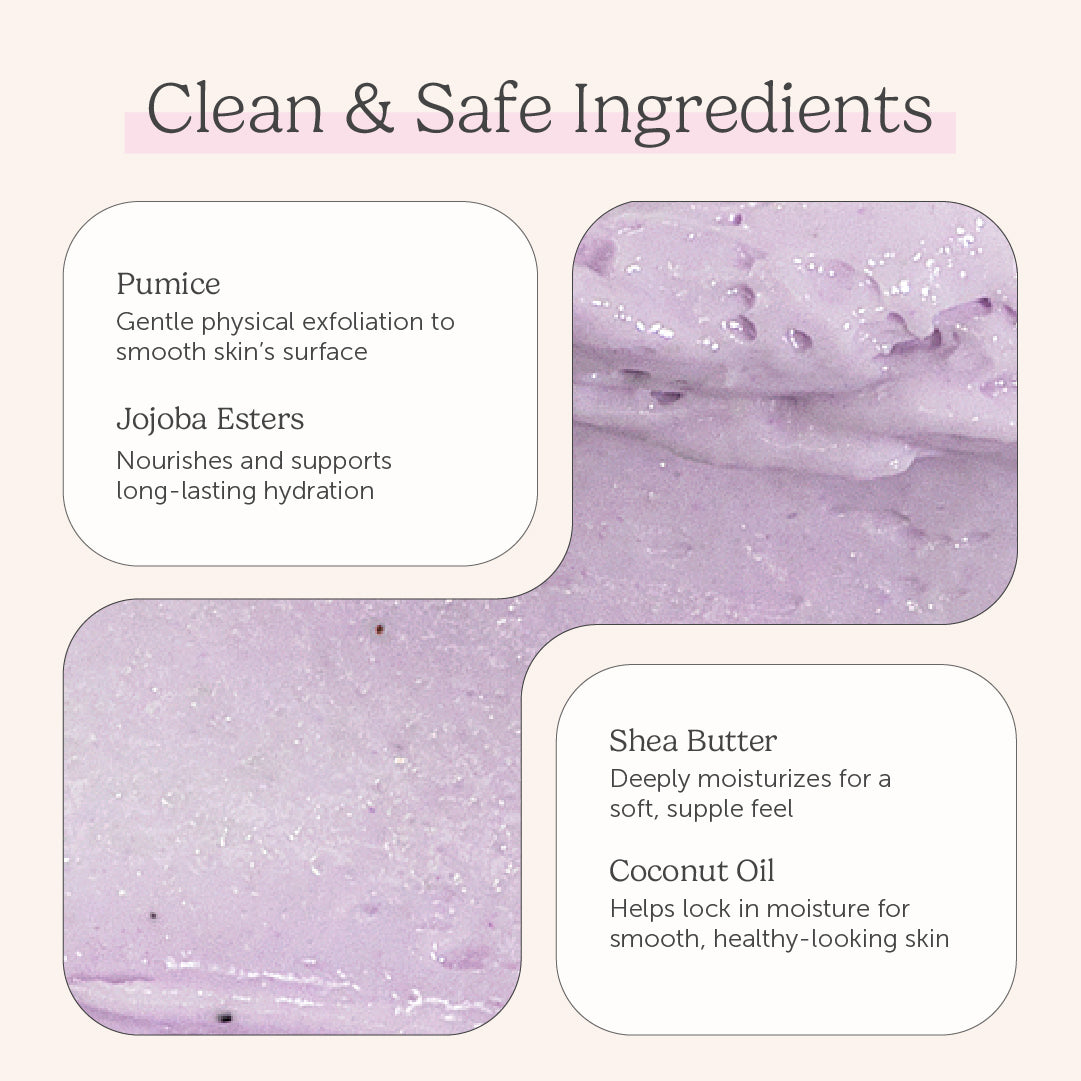 Massage onto clean, wet skin in the shower using gentle circular motions. Focus on rougher areas like elbows, knees, and feet. Rinse thoroughly with warm water. For best results, use once or twice a week and follow with your favorite body butter or whipped soap.