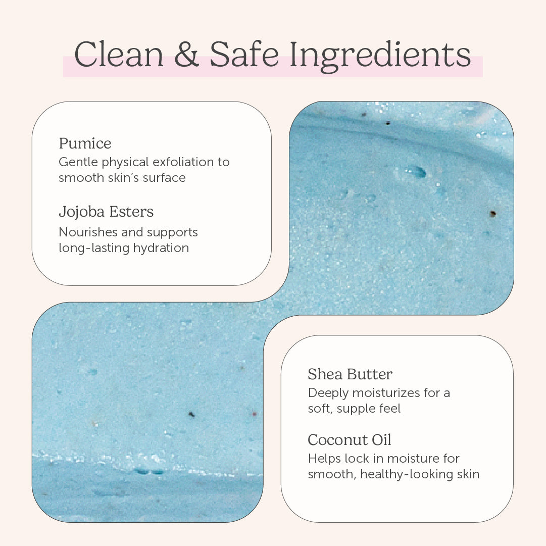 Ocean Breeze: Aqua (Water), Jojoba Esters, Butyrospermum Parkii (Shea) Butter, Cocos Nucifera (Coconut) Oil, Pumice, Emulsifying Wax NF, Cetyl Alcohol, Stearic Acid, Parfum (Fragrance), Phenoxyethanol, Caprylyl Glycol, Benzyl Alcohol, Tocopheryl Acetate, Maranta Arundinacea (Arrowroot) Powder, Aloe Barbadensis Leaf, Mica, Tin Oxide, Titanium Dioxide, Ultramarine Blue